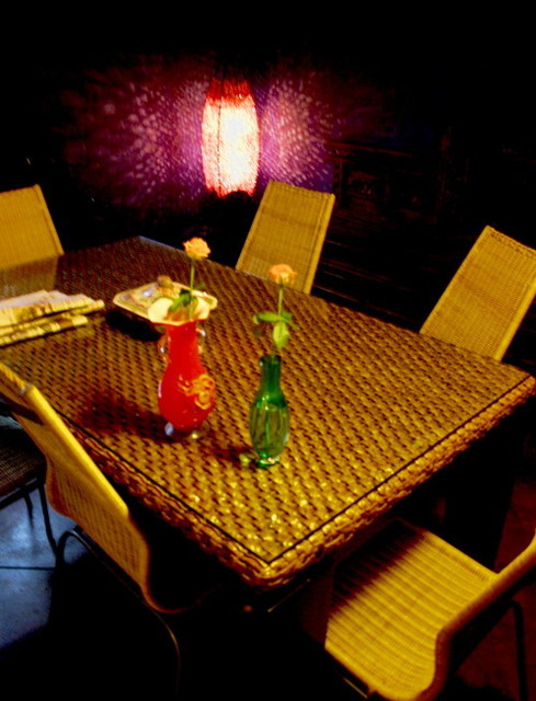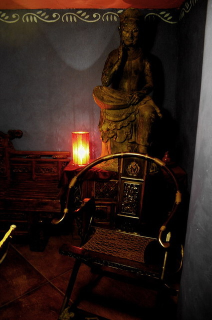 我喜歡在她主廳獨立小房間用餐,這間雖然空調略差,但有一種神秘氣息,靈性感覺很特殊,在這密室裡,餐桌四周坐擁百年骨董家具,還有一尊兩人高的坐佛,一張西藏達賴喇嘛來台灣弘法坐過的椅子。據老闆娘表示,在這房間相親,成功率極高。
