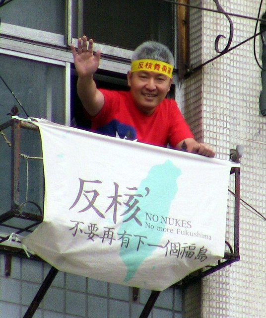 社運人士何宗勳特別身穿「賭博共和國」國旗衣,頭綁「反核義勇軍」,一早在自家陽台掛「反核旗」,由於位於馬路中央,非常清楚顯目。