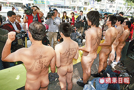 六名來自三所大專院校的男生在性器官貼上「拒當環保無賴」字樣,在行政院前羞澀地完成首次裸體抗議,要求政府正視《京都議定書》規範內容。中央社