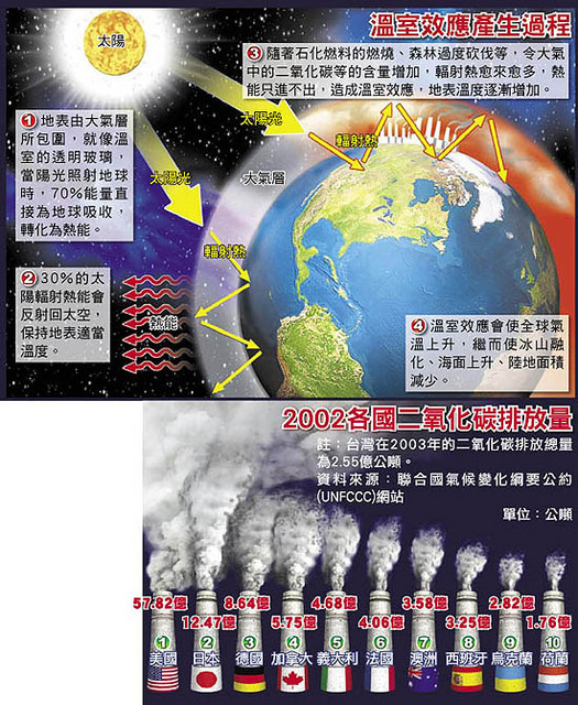 由主要工業國簽定的《京都議定書》內容主要在規範各國二氧化碳排放量,在二○一○年時須回復到一九九○年以前水準,減緩溫室效應;台灣並非締約國,自訂的規範為二○二○年時回復至二○○○年的排放量。環保團體對政府未遵守國際公約內容感到不滿。