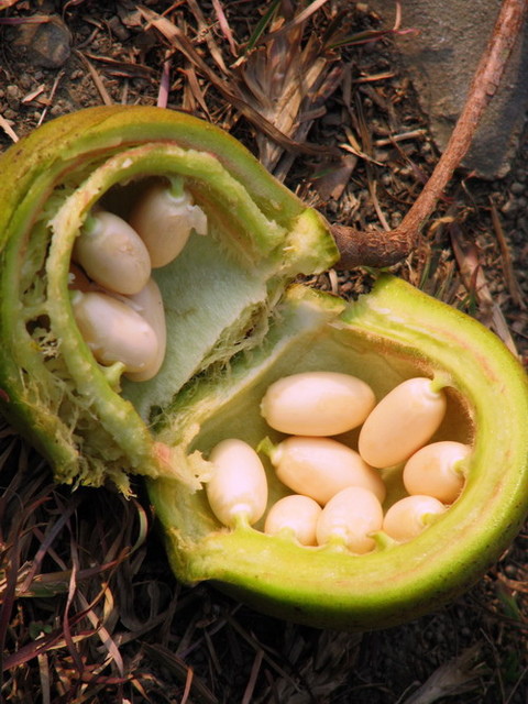 他的殼非常堅硬,要用力摔或用鐵鎚才能撬開,裡面種子非常大。外表要紅透,才能摘下來吃。只要把種子放到烤箱慢慢烤到熟,香氣就會慢慢噴出來,味道有如花生般可口,因為比一般花生大兩三倍,俗稱美國花生。